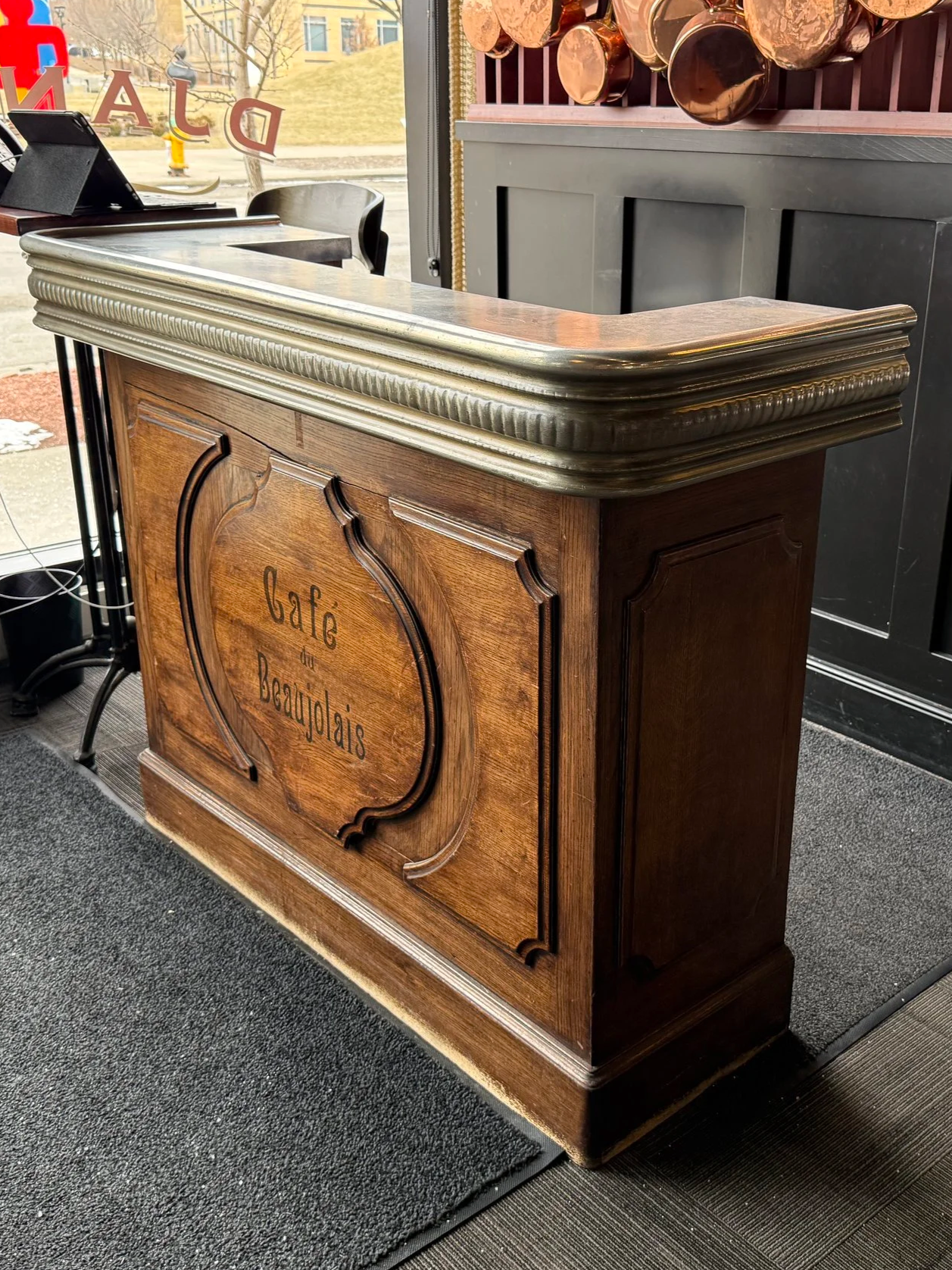 Wood host stand with zinc countertop purchased at the antiques store Bistrots d'Autrefois on Bd. du Montparnasse in Paris in 2006.