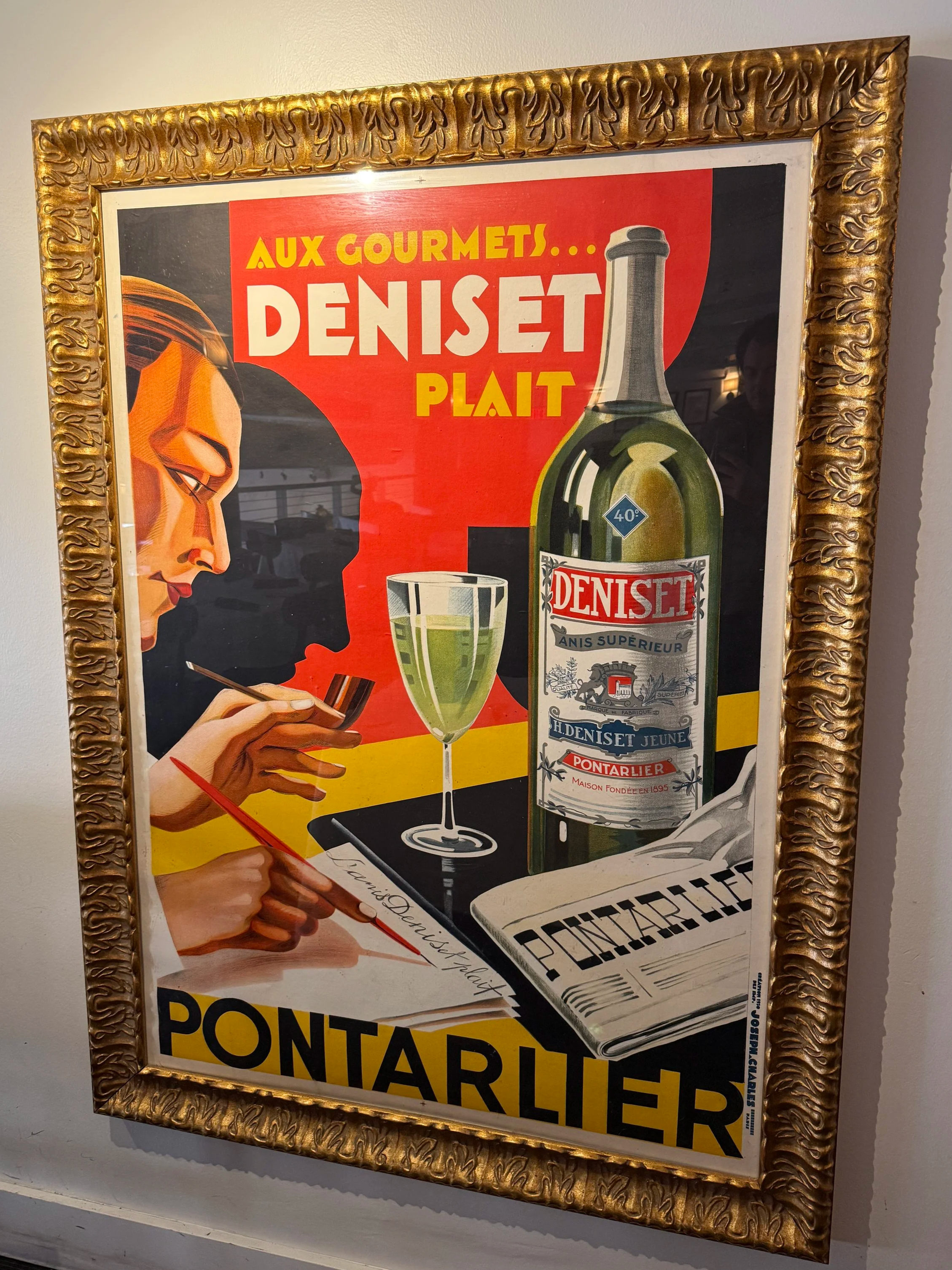 Framed “Aux Gourmets Deniset Plait Pontarlier” print. Joseph Charles, 1930s.