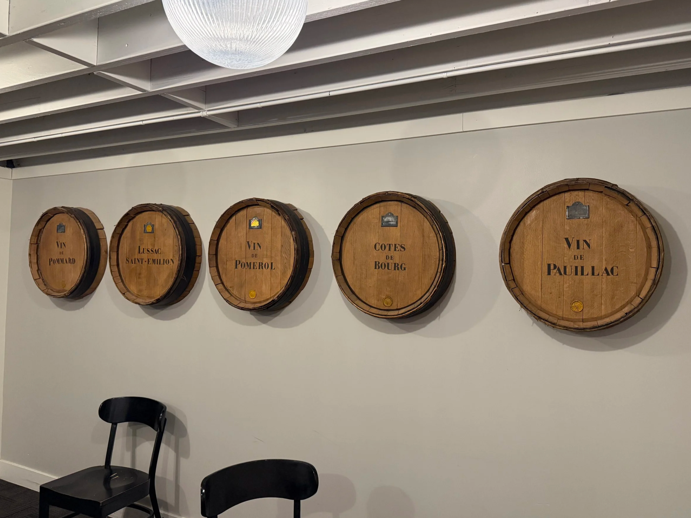 Set of five wine barrel heads: Vin de Pauillac, Cotes de Bourg, Vin de Pomerol, Lussac Saint-Emilion, Vin de Pommard.