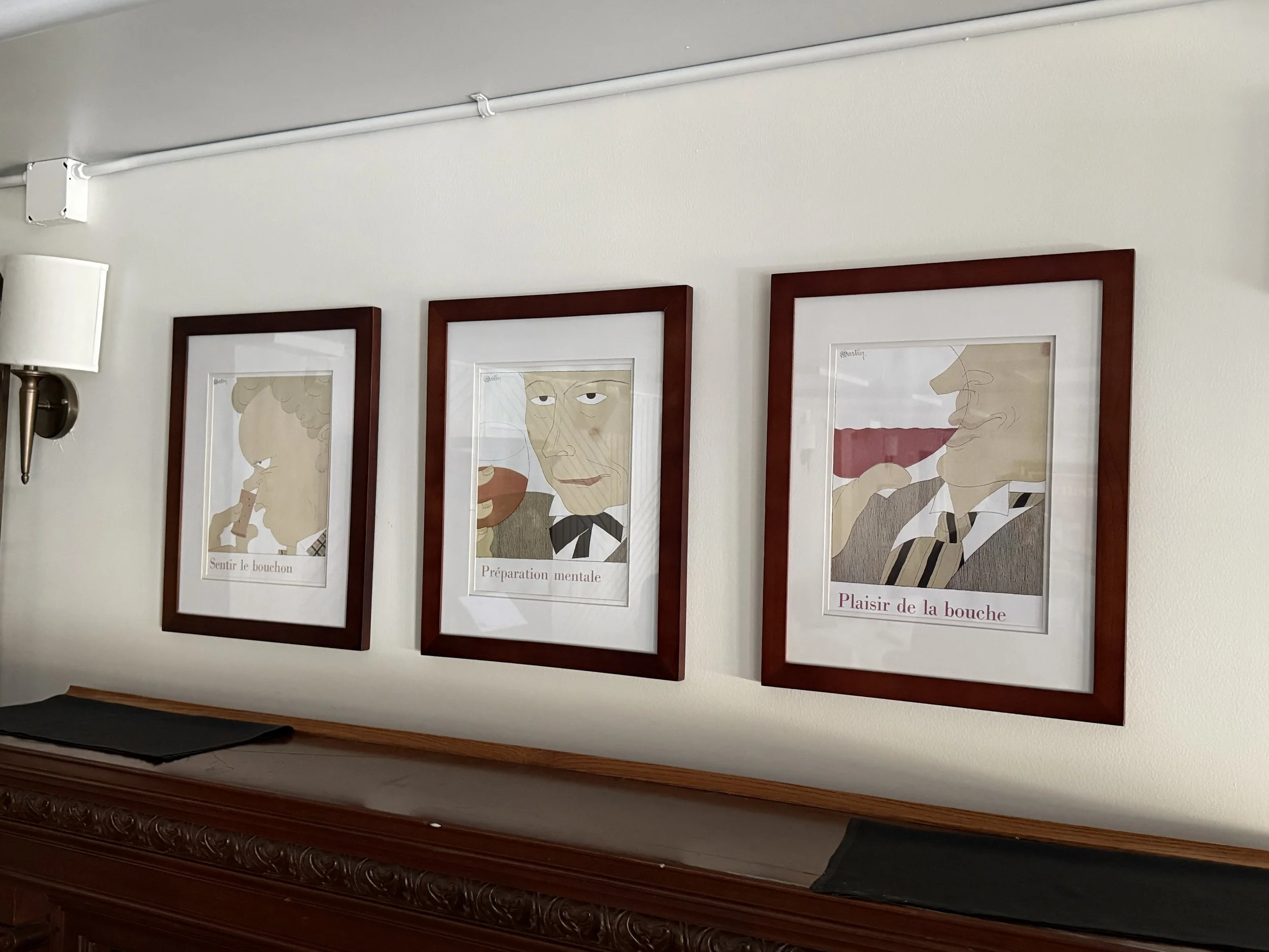 Three framed prints from the 1927 "Monseigneur Le Vin: L'Art de Boire" commissioned by the French wine distributor Nicolas. Sentir le bouchon (Feel the cap), Préparation mentale (Mental preparation), Plaisir de la bouche (Pleasure of the mouth).