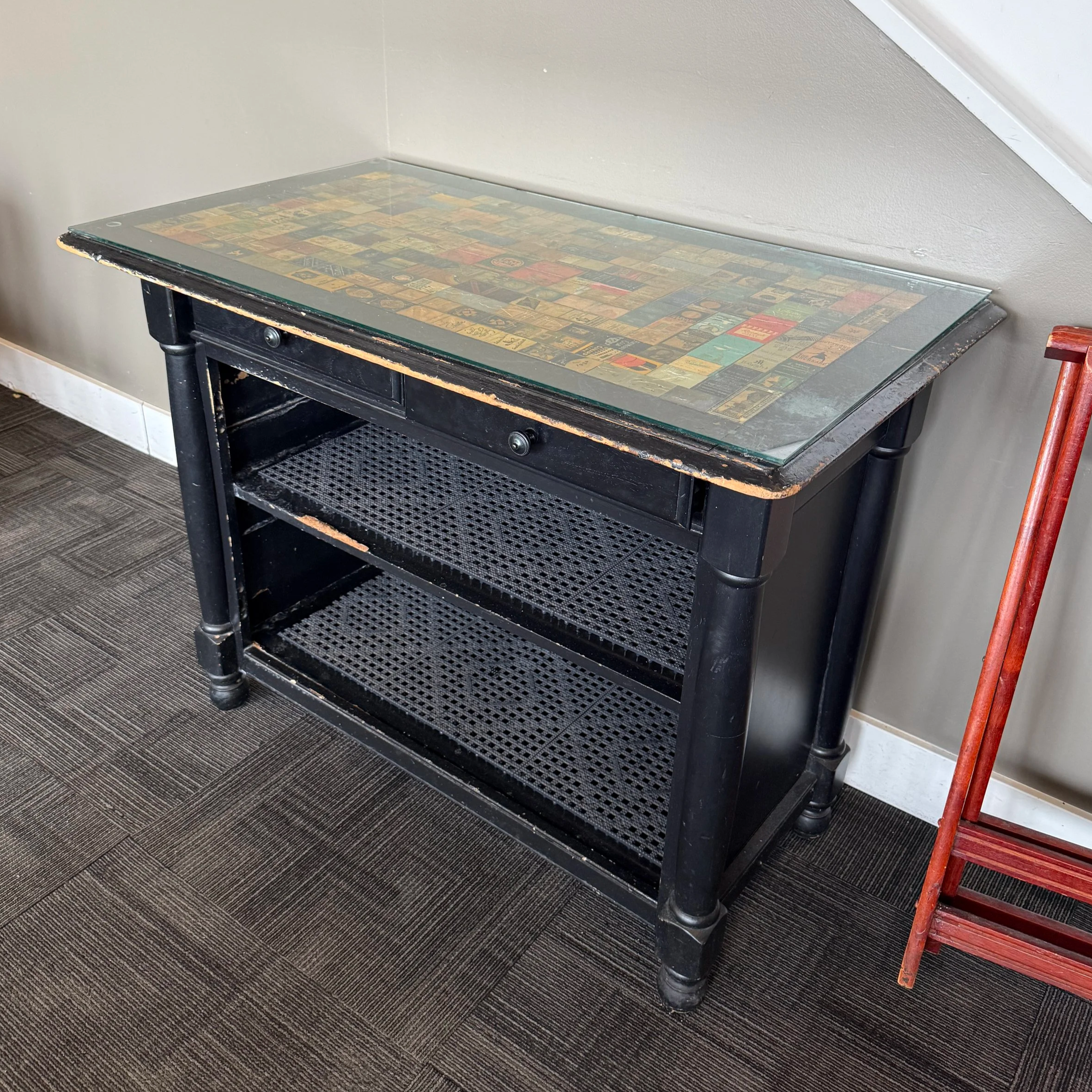 Table with vintage matchbook inlay and glass topper. Matchbooks from WWII-era Des Moines, New York City and Washington DC.