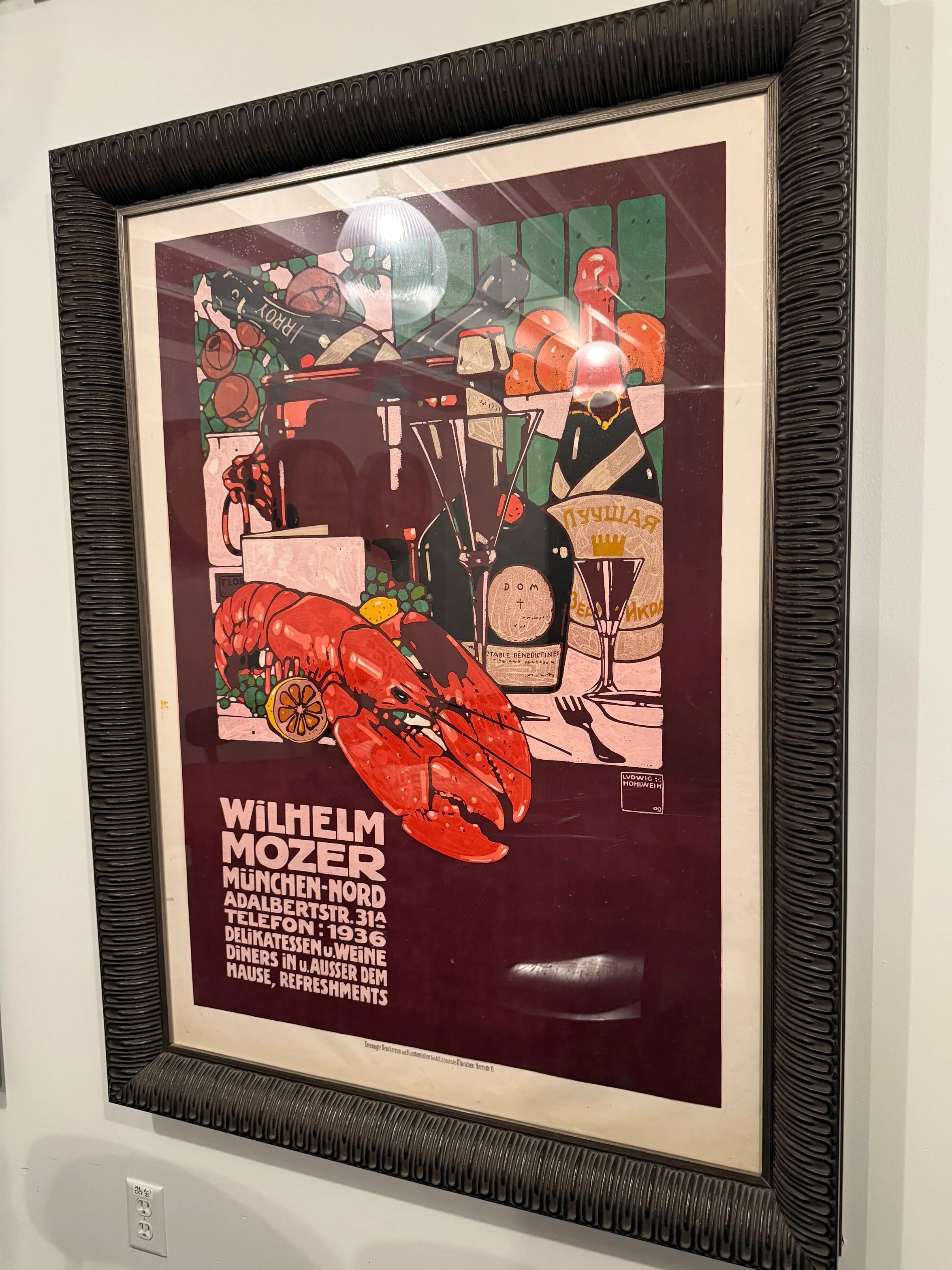 Framed “Wilhelm Mozer Delicatessen and Wines” print.