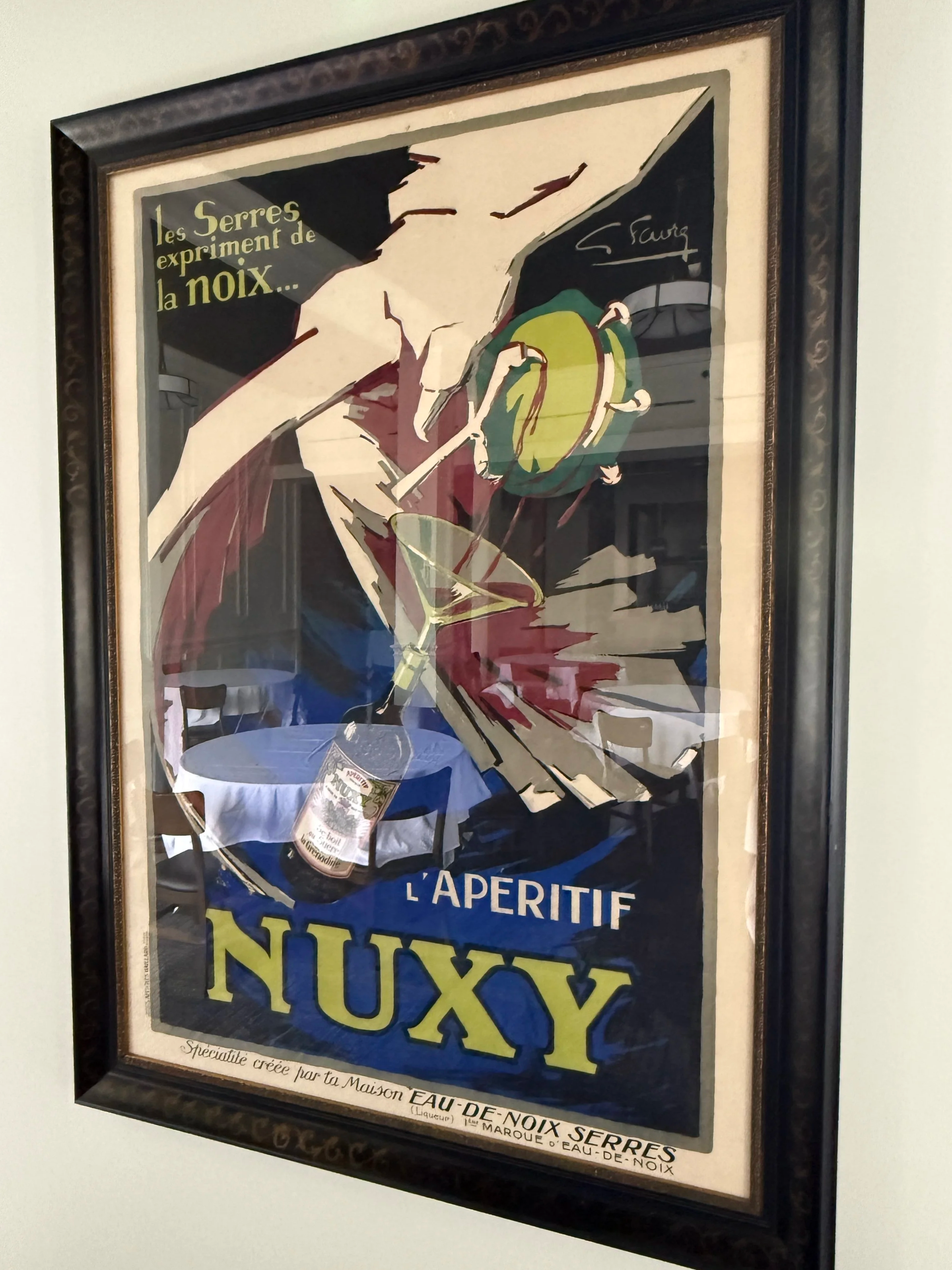 Framed “L’Apertif Nuxy” print. Gabriel Favre, 1930.